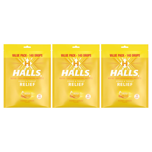 3 Pack - Halls Relief Honey Lemon Cough Drops Value Pack 140 Count Each