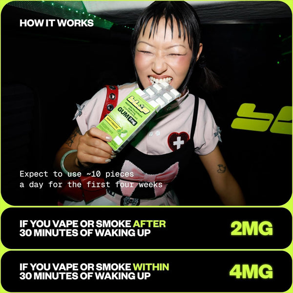 Try 2mg if you vape or smoke more than 30 minutes after waking up or 4mg if you regularly vape or smoke within 30 minutes of waking up. Take at least nine lozenges per day for the first six weeks, and then gradually wean your way off for the next six weeks.