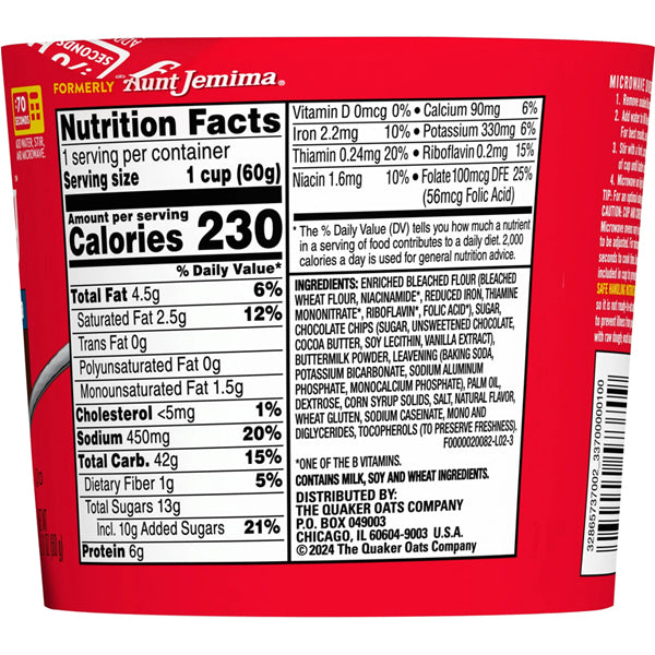 Making pancakes just got simpler with Pearl Milling Company Chocolate Chip Pancake on the Go cups. Simply add water, stir, and microwave for 70 seconds for a perfectly fluffy pancake in a cup that you can enjoy anytime, anywhere. For over 130 years, we've helped families gather to celebrate special moments with fluffy and light-textured pancakes and great tasting syrups. While our name has changed, our commitment to producing delicious products has not. Here's to stacking up life's sweetest moments from graduations to birthdays and everything between. Pearl Milling Company Pancake on the Go Pancake Mix Chocolate Chip Flavor 2.11oz Cup Contains Milk, Soy and Wheat ingredients. Egg Free product.