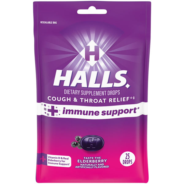 HALLS Cough and Throat Relief + Immune Support Elderberry Flavor Cough Drops are ready for whatever life throws, or coughs, your way. Packed with 50 percent daily value of Vitamin D per serving for immune support and made with real elderberry, these throat lozenges help clear mucus, soothe coughs, and cool nasal passages. In an enjoyable elderberry flavor, HALLS Cough and Throat Relief + Immune Support Drops are dietary supplements formulated for adults and children five years and older. Each resealable bag contains 25 individually wrapped drops, great for tossing in pockets or bags for convenient access when symptoms strike.