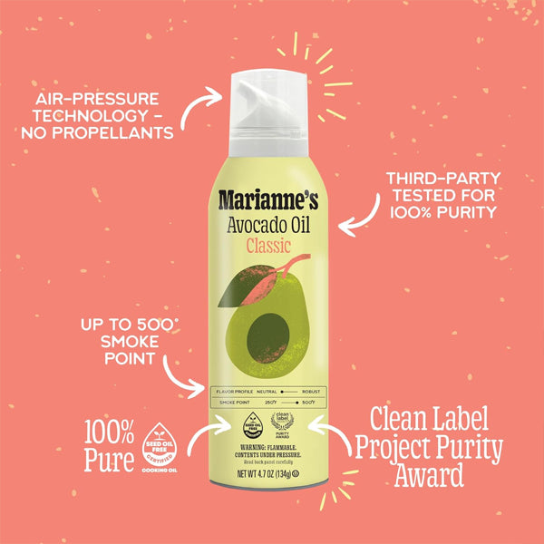 Elevate your everyday cooking with Marianne’s 100% Pure Avocado Oil Cooking Spray. Made with high-quality avocado oil, this clean, versatile spray delivers a light, even coating that helps prevent sticking without overpowering your food. Ideal for sautéing, grilling, baking, and air frying, it offers a high smoke point and a naturally mild flavor that complements any dish.