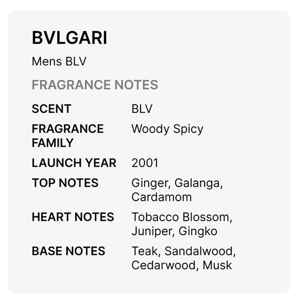 BLV Pour Homme belongs to the Woody Spicy fragrance family, making it a perfect choice for men who appreciate a blend of warmth and sophistication. The scent opens with invigorating top notes of Ginger, Galanga, and Cardamom, which immediately captivate the senses with their spicy freshness.
