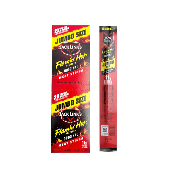 Unleash Your FLAMIN' HOT® with JACK LINK'S® FLAMIN' HOT® Flavored Original jumbo meat stick. This jumbo-sized snack combines the classic, smoky taste of Jack Link's® with the fiery kick of FLAMIN' HOT® flavor. Perfect for those who want an intense, bold taste experience, this jumbo meat stick delivers unmatched flavor and heat in every bite.