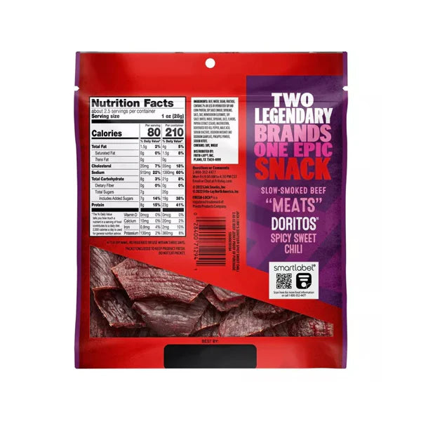 Level up your snack game with JACK LINK’S® DORITOS® SPICY SWEET CHILI beef jerky. Some call it their “kryptonite”, others call it the “bangingest sweet salty” flavor we have. Experience this bold, epic mashup that will make your tastebuds scream, what is this deliciousness?! Two legendary brands, one epic snack. Slow-Smoked beef “meats” Doritos® Spicy Sweet Chili.