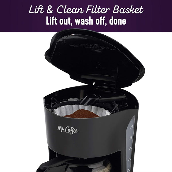 Experience the perfect blend of ease and functionality with the Mr. Coffee Black Coffee Maker. This 12-cup coffee maker does not only make expertly brewed, rich tasting coffee, but it also eliminates stress or mess thanks to its classic and user-friendly features. Be it a single cup or 12, this automatic coffee maker has a grab-a-cup auto pause feature that stops brewing if you need a cup before brewing is completed, and resumes brewing once the carafe is back in position. The appliance also includes an easy cord storage to manage unnecessary counter clutter. Each coffee maker from Mr. Coffee ensures quick and easy filling and cleaning due to its removable basket filter that effortlessly lifts out.